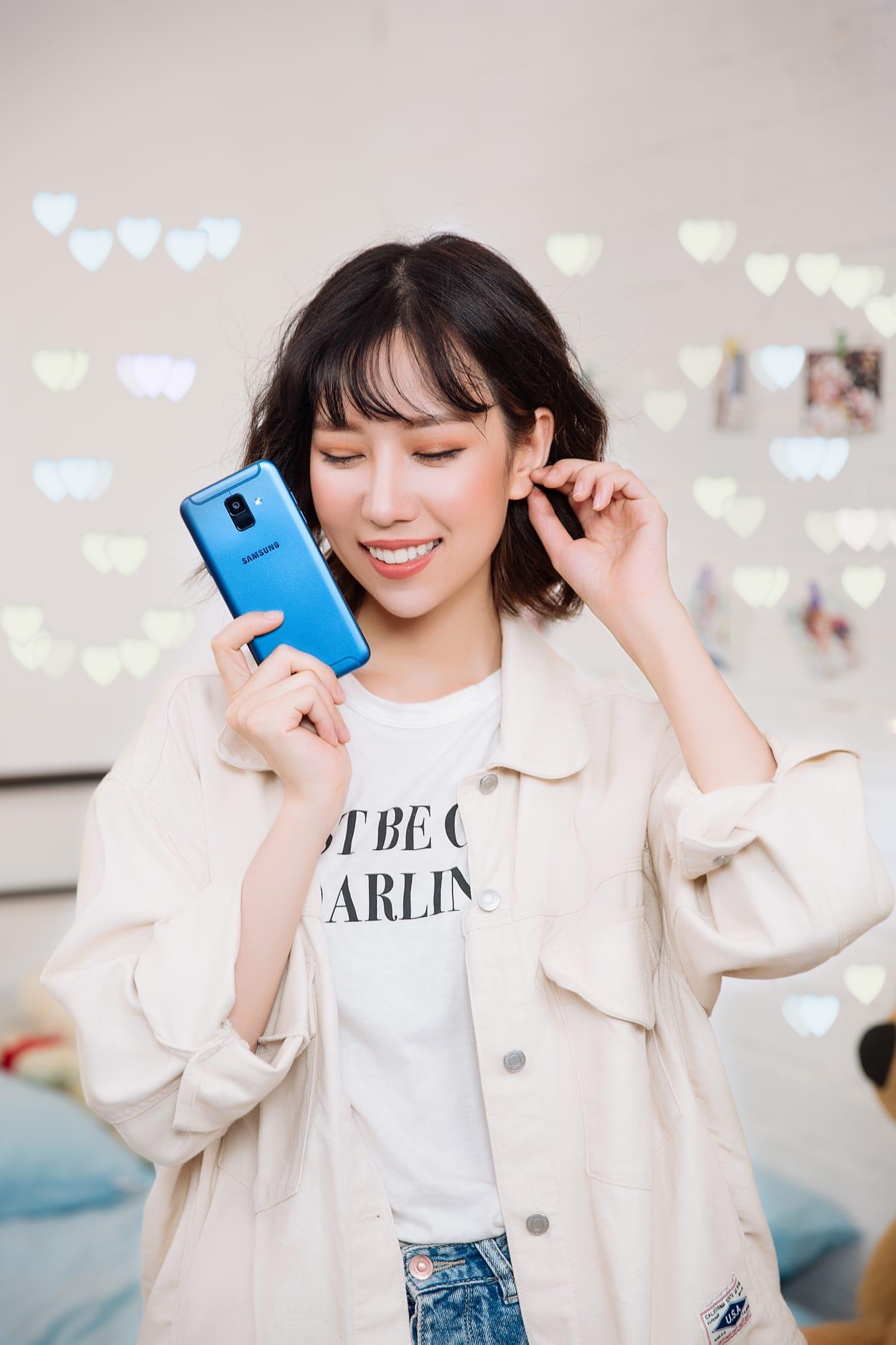Cô nàng Min pose với bạn đồng hành Galaxy A6.