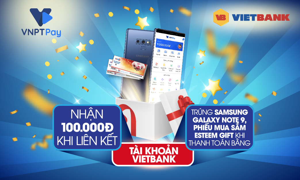 Ngoài ra, chương trình khuyến mãi “Thanh toán qua VIETBANK - VNPT Pay trúng ngay siêu phẩm” mang tới cơ hội trúng một trong các phần quà gồm: 06 điện thoại Samsung Galaxy Note 9 trị giá 28.490.000đ/chiếc và 15 phiếu mua sắm Esteem Gift trị giá 01 triệu đồng/phiếu cho các khách hàng thực hiện thanh toán thành công qua ứng dụng (app) VNPT Pay chỉ từ 50.000đ/giao dịch (không áp dụng giao dịch nạp/rút/chuyển tiền) bằng nguồn tiền từ tài khoản ngân hàng Vietbank.