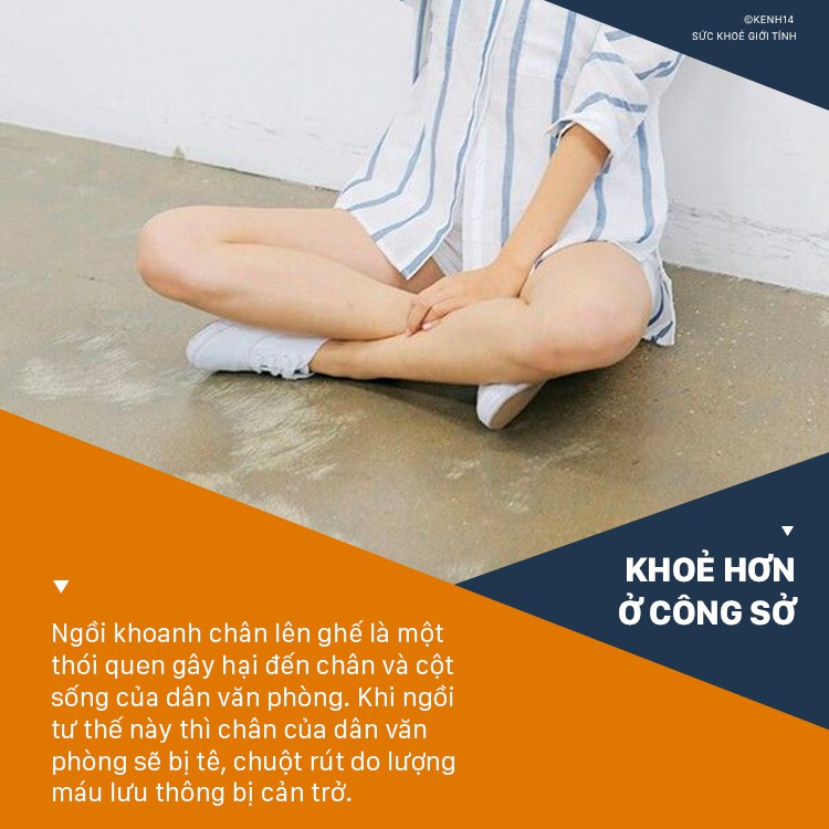 Ngồi khoanh chân là một trong những tư thế thường thấy của người làm văn phòng. Việc thay đổi cách ngồi này có thể giúp dân văn phòng cảm thấy thoải mái tạm thời. Tuy nhiên, về lâu dài thì thói quen này cũng gây lên những tác động xấu khiến cột sống bị ảnh hưởng.