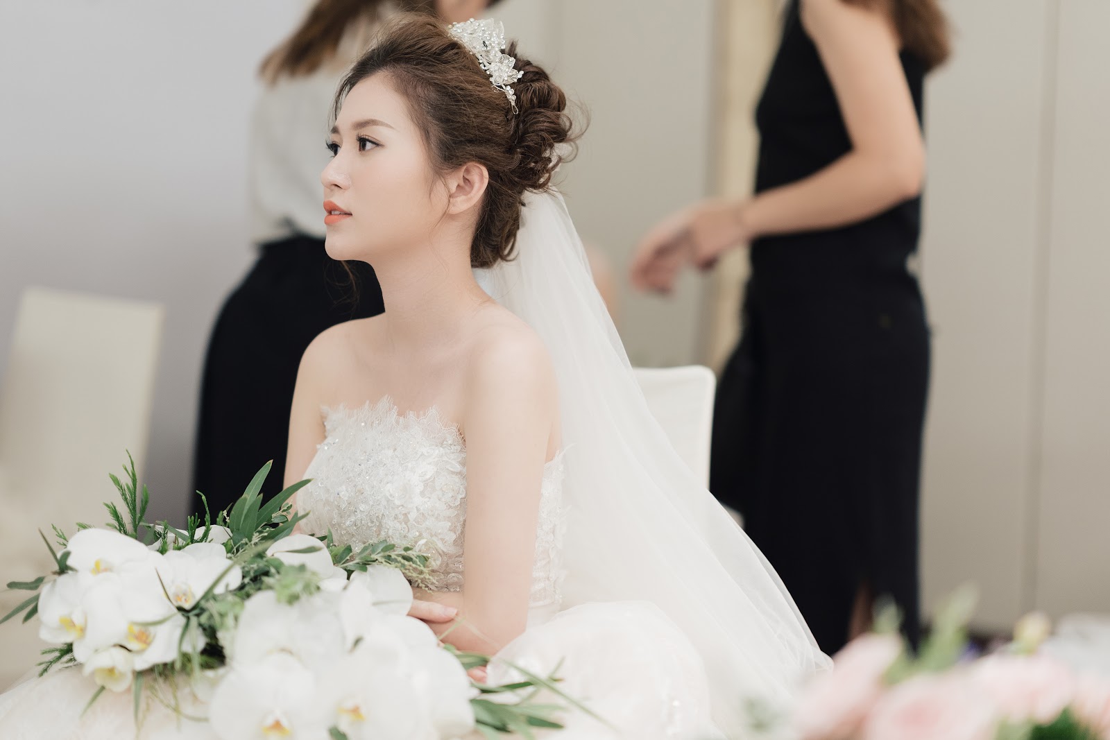 Không nhấn eyeliner sắc sảo, không nhấn môi son đỏ thắm; toàn bộ dàn mẫu trong show diễn của Calla Bridal được phủ một lớp trang điểm trong suốt, điểm xuyết cành hoa nhỏ trên mái tóc đen tuyền, tôn lên vẻ đẹp tự nhiên của người phụ nữ trong chiếc váy cưới trắng muốt, bồng bềnh.