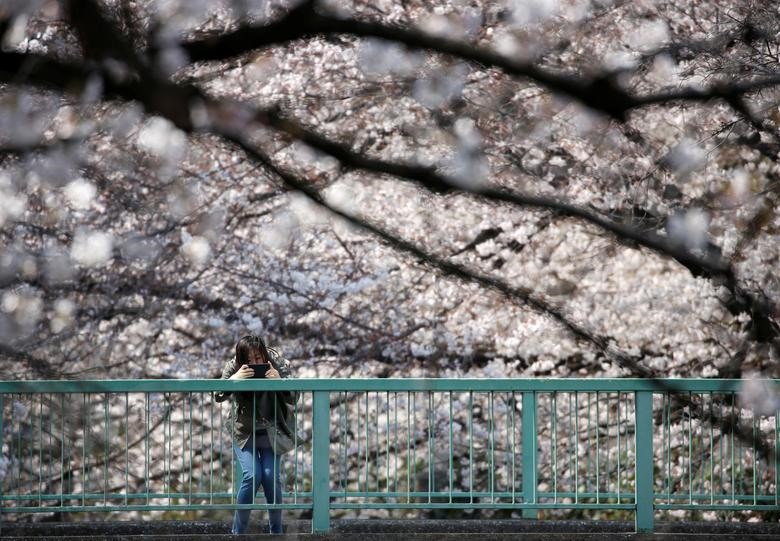 Cô gái xinh đẹp chụp ảnh trước hoa anh đào đang nở rộ ở Tokyo, Nhật Bản. Ảnh: Reuters.