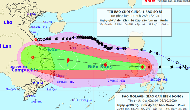 Trong 24 đến 48 giờ tiếp theo, bão di chuyển chủ yếu theo hướng Tây Tây Bắc, mỗi giờ đi được 20-25km và có khả năng mạnh thêm. Đến 01 giờ ngày 28/10, vị trí tâm bão ở khoảng 14,5 độ Vĩ Bắc; 111,3 độ Kinh Đông, cách bờ biển các tỉnh từ Quảng Nam đến Phú Yên khoảng 240km về phía Đông. Sức gió mạnh nhất vùng gần tâm bão mạnh cấp 12-13 (115-150km/giờ), giật cấp 15.