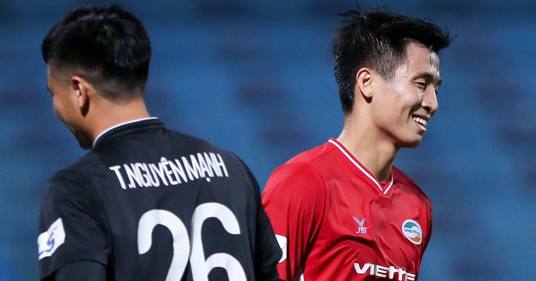 Sau tình huống thót tim, Bùi Tiến Dũng nở nụ cười với Nguyên Mạnh. Thủ môn sinh năm 1990 tiếp tục cho thấy sự tập trung và quyết đoán trong các tình huống quyết định. Ở trận trước, anh cản phá quả phạt đền ở phút cuối giúp Viettel vượt qua CLB TP.HCM với tỷ số tối thiểu