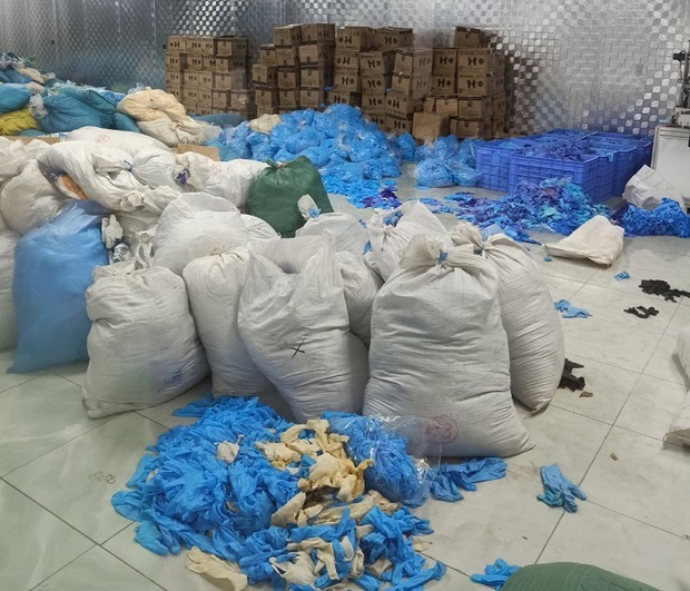 Theo Cục QLTT Bắc Ninh, tại thời điểm ập đến kiểm tra, hàng trăm bao tải chứa trữ các mặt hàng găng tay cao su màu xanh, trắng các loại có dấu hiệu bẩn thỉu, nhăm nhúm, không đảm bảo chất lượng được vứt bữa bãi và rơi lả tả trong kho hàng.