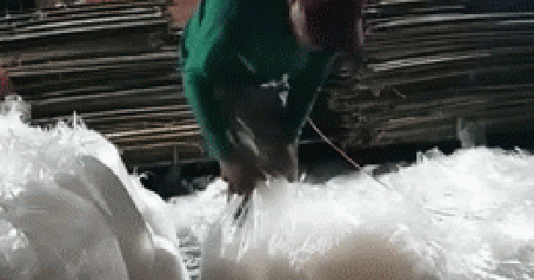Không những thế, trong đoạn clip, những công nhân trong xưởng đang cho bánh tráng vào trong túi nilon. Vì bánh tráng nhẹ và phồng, một nam công nhân còn dùng chân giẫm lên, đè bẹp bánh tráng trong túi nilon xuống.
