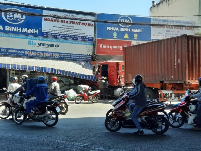 Tại hiện trường, đầu xe container đâm sập một phần phía trước nhà dân đang buôn bán, phần rơ-mooc chở container chắn ngang đường. Một phần phía trước căn nhà bị hư hỏng.